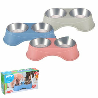 Futter und Trinknapf, Größe: 36 x 19,5 x 9 cm, aus Kunststoff mit 2 Edelstahlnäpfen, 3-fach sortiert, im Fotokarton