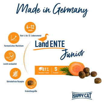 Die Kombination aus schmackhafter Ente und zarter Karotte liefert eine ausgewogene Basis an Nährstoffen für deine junge Katze. Das enthaltene Vitamin C unterstützt die körpereigene Abwehr. Die getreidefreie Rezeptur belastet nicht und fördert das Wohlbefinden deiner Jungkatze. Somit ist Happy Cat Junior Land-Ente das perfekte Futter für heranwachsende Katzen.