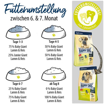 Ab dem 18. Lebensmonat sollte langsam auf ein Adult-Futter umgestellt werden. Hier können wir dir z.B. Happy Dog Sensible Neuseeland empfehlen.