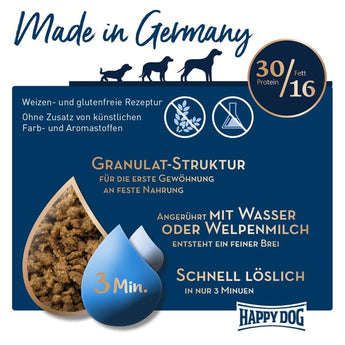 Die feine Granulat-Struktur eignet sich ideal für die erste Gewöhnung an feste Nahrung und zur problemlosen und schonenden Anfütterung in der Entwöhnungsphase der Welpen ab dem 21. Lebenstag. Angerührt mit Wasser oder Puppy Milk (Happy Dog Puppy Milk) entsteht ein feiner Brei, der von den Welpen mit großer Begeisterung angenommen wird. Happy Dog Puppy Starter Lamm & Reis zeichnet sich zudem durch eine schnelle Löslichkeit aus: bereits nach 3 Minuten kann der Brei verfüttert werden.