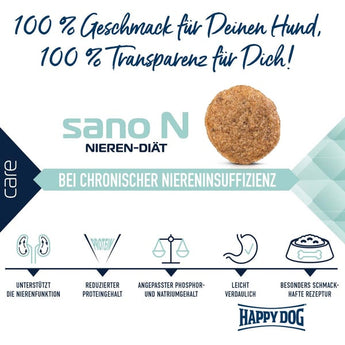 Es wird empfohlen, vor der Verwendung von Happy Dog Sano N oder vor Verlängerung der Fütterungsdauer den Rat eines Tierarztes einzuholen und die Nierenfunktion weiterhin regelmäßig kontrollieren zu lassen.