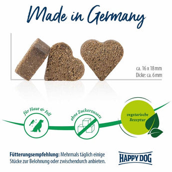 Der herzförmige Soft-Snack Happy Dog India ist ideal zum Verwöhnen deines Lieblings oder als kleine Mahlzeit für zwischendurch. Die Kombination aus gut verträglichem Reis und Erbsen mit den wertvollen Eigenschaften von Cranberries, Kokos und Kurkuma ist ein wahres Geschmackserlebnis für anspruchsvolle Gourmets. Der vegetarische Snack eignet sich auch optimal für sensible sowie anspruchsvolle Hunde mittlerer und großer Rassen und ist tierärztlich empfohlen bei Futtermittelunverträglichkeiten. Natürlich werden die Snacks ohne den Zusatz von Zucker und Konservierungsstoffen hergestellt und haben einen Wiederverschluss, der für langanhaltende Frische sorgt. Genussvolle Verwöhnmomente garantiert!