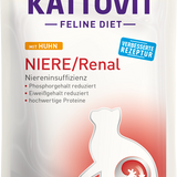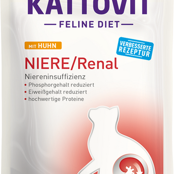 Zur Unterstützung der Nierenfunktion bei chronischer Niereninsuffzienz und zur Verringerung von Oxalsteinbildung. Kattovit Feline Diet - NIERE/RENAL wurde speziell entwickelt, um die Katzen mit einem reduzierten Eiweißgehalt zu versorgen, durch die Verwendung von hochwertigem Protein in einer leicht verdaulichen Zusammensetzung. Hohe Eiweißgehalte können sich schädigend auf die Nieren auswirken. Entscheidend ist dabei der Proteingehalt bezogen auf die Energiemenge. Bei Kattovit NIERE/ RENAL wird, im Gegensatz zu herkömmlichem Futter, nur etwa die Hälfte der Energie durch Eiweiß erbracht. Die Anreicherung mit Kaliumcitrat wirkt harnalkalisierend und kann somit der Oxalat-Kristallbildung vorbeugen (Oxalatprophylaxe). Die Gehalte an Phosphor und Natrium sind reduziert.