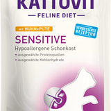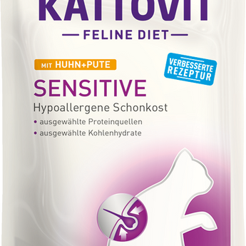 Zur Minderung von Ausgangerzeugnis- und Nährstoffintoleranzerscheinungen. Kattovit Feline Diet - SENSITIVE für sensible Katzen, die unter bestimmten Futtermittelallergien leiden. Exklusions-Diät: Es werden ausschließlich die Fleischsorten verwendet, wie in der Sorte genannt. Auf die Beifütterung von Leckereien sollte verzichtet werden.