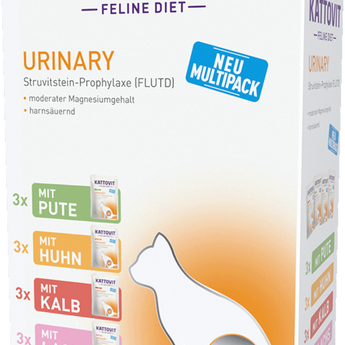 Zur Verringerung von Struvitsteinrezidiven und der Erkrankung der unteren Harnwege bei Katzen. Kattovit Feline Diet - URINARY wurde nach neuesten wissenschaftlichen Erkenntnissen entwickelt. Zur Vorbeugung von Harnsteinen (Feline lower urinary tract disease - FLUTD) wurde die Zusammensetzung des Futters so entwickelt, dass der pH-Wert des Katzenurins mit 6,5 deutlich im niedrigen Bereich liegt. Kattovit URINARY enthält harnansäuernde Stoffe (DL-Methionin und Calciumsulfat) und hat einen niedrigen Magnesiumgehalt. Zur Vorbeugung sind eine hohe Verdaulichkeit und eine hohe Energiedichte wichtig.