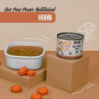 Unsere Paw Power Drinks bestehen aus frischem Fleisch, viel Flüssigkeit und leckerem Gemüse. Als praktisches Ergänzungsfuttermittel haben sie eine besonders hohe Akzeptanz und dank des schonenden Kochverfahrens bleiben wichtige Vitamine und Mineralstoffe erhalten.