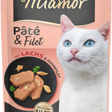Miamor Pâté & Filet - ausschließlich pures Fleisch und Innereien in bester Qualität. Ergänzt mit sichtbaren, hochwertigen Huhnfiletstücken, bieten sie eine verführerische Futterportion für das tägliche Wohlergehen anspruchsvoller Katzen. Die verwendeten Fleischsorten sind wertvolle Eiweiß-, Vitamin D- und Taurin-Lieferanten. Getreidefreie, glutenfreie und zuckerfreie Rezeptur, ohne Farb- und Konservierungsstoffe.