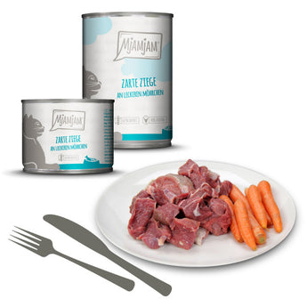 Ziege (65 %), Fleischbrühe (29 %), Möhrchen (5 %), Mineralstoffe (1 %)