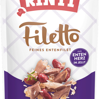 Helle Filetstückchen von der Ente in delikater Jelly, garniert mit Entenherz, zubereitet im Rinti-Schonverfahren. Diese Fleischmahlzeit ist nicht nur leicht verdaulich, sie bietet dem Hund auch ein besonderes Geschmackserlebnis.