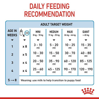 Hochangepasste Ersatzmilch von ROYAL CANIN® für die Ernährung mutterloser Welpen oder zur Beifütterung bei großen Würfen (1. Woche bis 4. Woche).