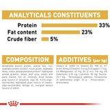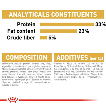 ANALYTISCHE BESTANDTEILE: Protein: 33,0% - Rohfaser: 4,9% - Fettgehalt: 23,0% - Rohasche: 7,4%, Omega-6-Fettsäuren: 4,7% - Omega-3-Fettsäuren: 1% - EPA/DHA: 0,4% - L-Carnitin: 50 mg/kg