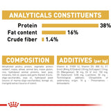 ANALYTISCHE BESTANDTEILE: Protein: 38,0% - Rohfaser: 1,4% - Fettgehalt: 16,0% - Rohasche: 7,9% - Omega-6-Fettsäuren: 3,8% - Omega-3-Fettsäuren: 0,7% - L-Carnitin: 50 mg/kg