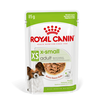 ROYAL CANIN® X-Small Adult Häppchen in Soße ist eine nährstoffreiche und ausgewogene Feuchtnahrung, die den spezifischen Bedürfnissen Ihres sehr kleinen Hundes gerecht wird und ihn im Erwachsenenalter unterstützt. Diese Nahrung eignet sich für sehr kleine, bis 4 kg schwere Hunde ab 10 Monaten.