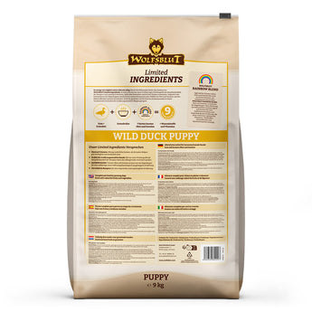 Entdecken Sie unsere innovative Produktlinie WOLFSBLUT Limited INGREDIENTS WILD DUCK PUPPY, bei der Qualität, Einfachheit und die bunte Vielfalt des RAINBOW BLEND die Grundlagen einer vollwertigen und ernährungsphysiologisch ausgeglichenen Hundeernährung bilden.