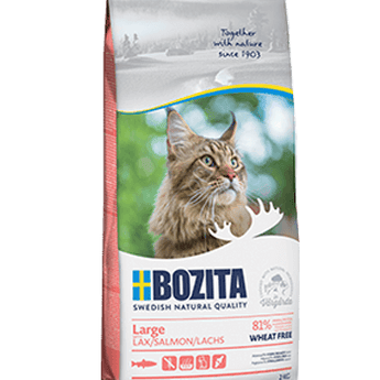 Bozita Large Weizenfrei Lachs ist ein Alleinfuttermittel für die erwachsene Katze. Inhalt und Krokettengröße sind besonders geeignet für große Katzen, Katzen, die zu schnell fressen sowie langhaarige Katzen. Frisch zubereiteter Lachs ist besonders schmackhaft und leicht verdaulich, sodass die Katze die Nährstoffe leichter aufnehmen kann. Lachs enthält gesunde Fettsäuren, die zusammen mit Biotin und Zink gute Voraussetzungen für gesunde Haut und gesundes Fell bieten. Für Katzen mit langem Fell haben wir unlösliche Faserstoffe hinzugefügt, die das Risiko der Haarballenentstehung reduzieren.