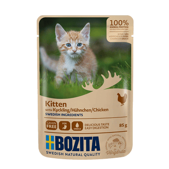 Bozita Kitten Huhn wurde speziell für heranwachsende und verspielte Kätzchen und trächtige oder säugende Katzen entwickelt. Es enthält auch gesunde Fettsäuren aus Lachs, die für die Entwicklung der Gehirnfunktion und der Sehkraft von Kätzchen wichtig sind. Die Einzelportionspackungen sind ein köstliches, getreidefreies Alleinfuttermittel mit den wichtigen Vitaminen und Mineralien, die deine Katze braucht. Alle Zutaten sind natürlich, frisch und stammen aus der schwedischen Landschaft und Natur. Wir arbeiten mit schwedischen Bauernhöfen zusammen und wählen nur Zutaten von höchster Qualität aus.
