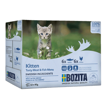 Bozita Kitten ist ein Alleinfuttermittel für Kitten und junge Katzen mit feineren Häppchen. Das Futter deckt den hohen Energie- und Proteinbedarf der jungen Katzen und bietet optimale Bedingungen für Wachstum und Muskelaufbau. Huhn und Lachs sind besonders schmackhaft und leicht verdaulich, sodass das Kitten die Nährstoffe leichter aufnehmen kann. Lachs enthält gesunde Fettsäuren, die unter anderem für die Entwicklung der Gehirnfunktion und des Sehvermögens der Kitten wichtig sind. Präbiotisches FOS fördert eine gesunde Darmflora. Das Produkt enthält ein optimales Gleichgewicht an Mineralstoffen (Ca, P, Mg) und einen hohen Anteil an Vitaminen und Taurin. Alle Zutaten werden sorgfältig aus der schwedischen Wildnis und von schwedischen Bauern ausgewählt.