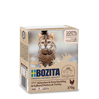 Bozita Häppchen in Soße mit Hühnchen & Pute ist eine von sechs leckeren, traditionellen schwedischen Geschmacksrichtungen. Eine komplette Katzennahrung für junge Kätzchen und erwachsene Katzen. Bozita Häppchen in Soße wird in praktischen, umweltfreundlichen Verpackungen angeboten, die sich beim Öffnen und Schließen einfach bedienen lassen. Bozita wird aus qualitativ hochwertigen Rohstoffen wie Fleisch und Fisch hergestellt. Das Produkt enthält weder Soja oder Getreide noch Konservierungsstoffe und es ist fettarm – nur 5 % Fett.