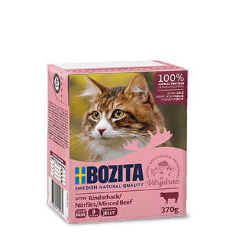Bozita Häppchen in Gelee mit Rinderhack ist eine von zwölf leckeren, traditionellen schwedischen Geschmacksrichtungen. Eine komplette Katzennahrung für junge Kätzchen und erwachsene Katzen. Bozita Häppchen in Gelee wird in praktischen, umweltfreundlichen Verpackungen angeboten, die sich beim Öffnen und Schließen einfach bedienen lassen. Bozita wird aus qualitativ hochwertigen Rohstoffen wie Fleisch, Fisch, Meeresschalentieren und Eiern hergestellt. Das Produkt enthält weder Soja oder Getreide noch Konservierungsstoffe und es ist fettarm – nur 5 % Fett.
