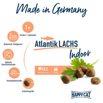 Wohnungskatzen bewegen sich oft weniger als Freigänger und können so die aufgenommene Energie nicht adäquat umsetzen. Das kann über einen längeren Zeitraum hin zu Übergewicht führen. Happy Cat Indoor Atlantik-Lachs enthält nur 12,0 % Fett und sorgt mit sättigenden Ballaststoffen für ein länger anhaltendes Sättigungsgefühl. So wird dein Stubentiger satt und behält seine schlanke Linie. Außerdem hat unser Indoor-Katzenfutter einen höheren Proteingehalt, so dass bei reduzierter Futtermenge trotzdem der benötigte Proteinbedarf deiner Samtpfote ausreichend abgedeckt ist.