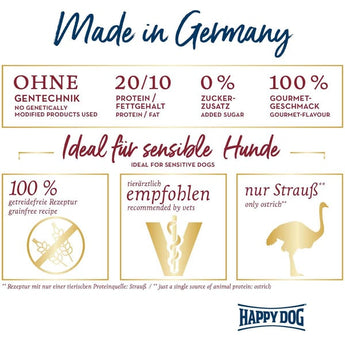 Du möchtest deinen kleinen Hund mit etwas ganz Besonderem verwöhnen? Exotischer Strauß und glutenfreie Kartoffel begeistern selbst die sensibelsten Feinschmecker. Kartoffeln enthalten kein Gluten und sind für Tiere mit Getreideunverträglichkeiten zu empfehlen. Strauß als seltene Proteinquelle zeichnet sich durch eine optimale Verträglichkeit aus. Wertvolle Omega-3 und Omega-6 Fettsäuren – wichtig für eine gesunde Haut und ein glänzendes Fell – runden die exklusive Rezeptur ab. Dies macht Sensible Mini Africa zu einem ausgewogenen und idealen Trockenfutter für kleine Hunde mit Allergien und Futtermittelunverträglichkeiten. Die außergewöhnlich schmackhafte Super-Premium-Vollnahrung Happy Dog Sensible Mini Africa ist zudem ideal für alle anspruchsvollen kleinen Hunde, die Abwechslung suchen oder sehr wählerisch sind.