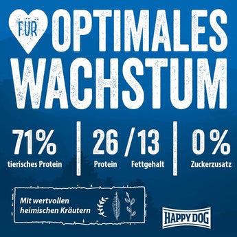 Die Wachstumsintensität nimmt ab dem 7. Lebensmonat stetig ab. Deshalb ist es wichtig, das Futter auf den nun geänderten Protein- und Energiebedarf anzupassen, um ernährungsbedingten Wachstumsstörungen vorzubeugen. Happy Dog NaturCroq Junior ist optimal auf die Bedürfnisse von Junghunden abgestimmt und sorgt für ein harmonisches und gesundes Wachstum in der Junghunde-Phase. Neben einem reduzierten Energiegehalt ist auch der Proteingehalt angepasst. Die Rezeptur von Happy Dog NaturCroq Junior mit wertvollen, tierischen Proteinen und wertvollem Vollkorngetreide aus der Region sorgt für eine optimale Entwicklung. Wertvolle Omega-3- und Omega-6-Fettsäuren sorgen für ein glänzendes Fell. Die äußerst schmackhafte Rezeptur enthält zudem wertvolle heimische Kräuter.