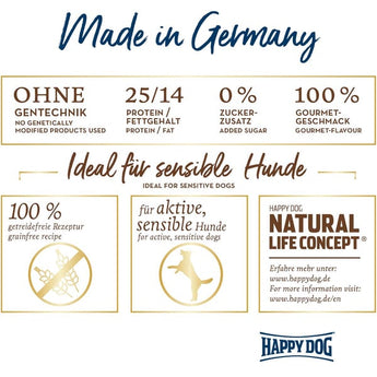 Die getreidefreie und schmackhafte Rezeptur von Happy Dog Canada mit einem leicht erhöhten Energiegehalt eignet sich ideal für ausgewachsene, aktive Vierbeiner ab 11 kg.
