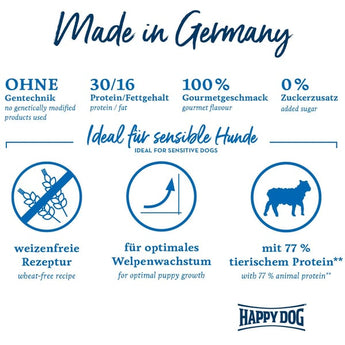 Um ein harmonisches Wachstum bei Welpen und Junghunden kleiner Rassen zu unterstützen ist eine ausgewogene Ernährung besonders in den ersten Lebensmonaten wichtig. Die Zusammensetzung des Welpenfutters sollte dabei ein optimales Verhältnis von Fetten und Proteinen aufweisen. Unser Happy Dog Sensible Mini Puppy bietet deinem kleinen Hund alle wichtigen Inhaltsstoffe in ausreichender Menge. Damit wird dein kleiner Hund mit allem versorgt, was er in den ersten Lebensmonaten benötigt.