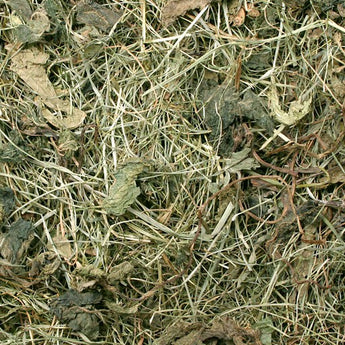 Schonend getrocknete Gräser und Kräuter mit sehr hohem Blattanteil. Angereichert mit vitamin- und mineralstoffreicher Brennnessel. Das Premium-Heu für die Gourmets unter den Nagern.