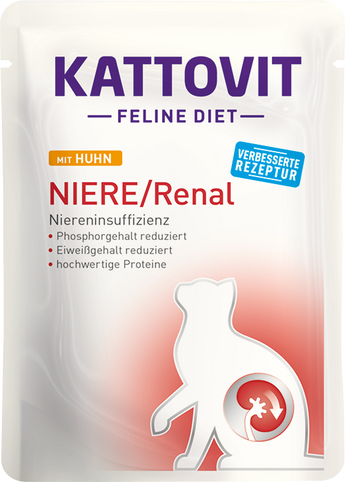 Zur Unterstützung der Nierenfunktion bei chronischer Niereninsuffzienz und zur Verringerung von Oxalsteinbildung. Kattovit Feline Diet - NIERE/RENAL wurde speziell entwickelt, um die Katzen mit einem reduzierten Eiweißgehalt zu versorgen, durch die Verwendung von hochwertigem Protein in einer leicht verdaulichen Zusammensetzung. Hohe Eiweißgehalte können sich schädigend auf die Nieren auswirken. Entscheidend ist dabei der Proteingehalt bezogen auf die Energiemenge. Bei Kattovit NIERE/ RENAL wird, im Gegensatz zu herkömmlichem Futter, nur etwa die Hälfte der Energie durch Eiweiß erbracht. Die Anreicherung mit Kaliumcitrat wirkt harnalkalisierend und kann somit der Oxalat-Kristallbildung vorbeugen (Oxalatprophylaxe). Die Gehalte an Phosphor und Natrium sind reduziert.