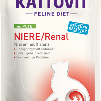 Zur Unterstützung der Nierenfunktion bei chronischer Niereninsuffzienz und zur Verringerung von Oxalsteinbildung. Kattovit Feline Diet - NIERE/RENAL wurde speziell entwickelt, um die Katzen mit einem reduzierten Eiweißgehalt zu versorgen, durch die Verwendung von hochwertigem Protein in einer leicht verdaulichen Zusammensetzung. Hohe Eiweißgehalte können sich schädigend auf die Nieren auswirken. Entscheidend ist dabei der Proteingehalt bezogen auf die Energiemenge. Bei Kattovit NIERE/ RENAL wird, im Gegensatz zu herkömmlichem Futter, nur etwa die Hälfte der Energie durch Eiweiß erbracht. Die Anreicherung mit Kaliumcitrat wirkt harnalkalisierend und kann somit der Oxalat-Kristallbildung vorbeugen (Oxalatprophylaxe). Die Gehalte an Phosphor und Natrium sind reduziert.