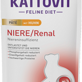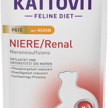 Zur Unterstützung der Nierenfunktion bei chronischer Niereninsuffizienz und zur Verringerung von Oxalsteinbildung. Kattovit Feline Diet - NIERE/RENAL wurde speziell entwickelt, um die Katzen mit einem reduzierten Eiweißgehalt zu versorgen, durch die Verwendung von hochwertigem Protein in einer leicht verdaulichen Zusammensetzung. Hohe Eiweißgehalte können sich schädigend auf die Nieren auswirken. Entscheidend ist dabei der Proteingehalt bezogen auf die Energiemenge. Bei Kattovit NIERE/RENAL wird, im Gegensatz zu herkömmlichem Futter, nur etwa die Hälfte der Energie durch Eiweiß erbracht. Die Anreicherung mit Kaliumcitrat wirkt harnalkalisierend und kann somit der Oxalat-Kristallbildung vorbeugen (Oxalatprophylaxe). Die Gehalte an Phosphor und Natrium sind reduziert.
