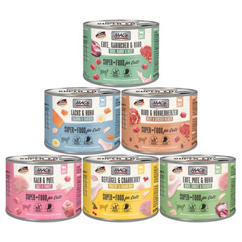 Der MAC's Cat 6er-Multipack Bestseller bietet eine köstliche Auswahl verschiedener Nassfuttermenüs für ausgewachsene Katzen. Enthalten sind die Geschmacksrichtungen Geflügel & Cranberry, Lachs & Hühnchen, Kalb & Pute, Rind & Hühnerherzen, Ente & Pute & Huhn sowie Ente & Kaninchen & Rind. Bei so großer Vielfalt kommt garantiert keine Langeweile am Futternapf auf.