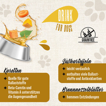 84,6% Gemüsebrühe, 5% Süßkartoffeln, 5% Kürbis, 5% Karotte, 0,25% Inulin, 0,1% Mineralstoffe, 0,05% Brennnesselblätter