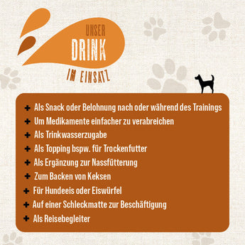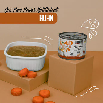 Unsere Paw Power Drinks bestehen aus frischem Fleisch, viel Flüssigkeit und leckerem Gemüse. Als praktisches Ergänzungsfuttermittel haben sie eine besonders hohe Akzeptanz und dank des schonenden Kochverfahrens bleiben wichtige Vitamine und Mineralstoffe erhalten.