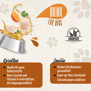 Die Variante Huhn ist mit Karotten verfeinert, welche eine großartige Quelle für Ballaststoffe, Vitamin A und Beta-Carotin sind. Das enthaltene Inulin fördert die Knochengesundheit und kann vor Herz-Kreislauf-Erkrankungen schützen.
