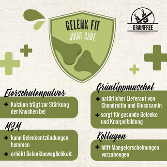 Die Variante Gelenk Fit kann die Mobilität verbessern und Gelenkentzündungen lindern. Kalzium trägt bspw. mit Eierschalenpulver zur Stärkung der Knochen bei, wobei die Grünlippmuschel als natürlicher Lieferant von Chondroitin und Glucosamin für gesunde Geleke und Knorpelbildung sorgt. MSM kann Gelenkentzündungen hemmen und die Gelenkbeweglichkeit erhöhen und Kollagen hilft auf natürliche Weise Mangelerscheinungen vorzubeugen.