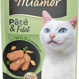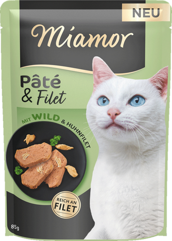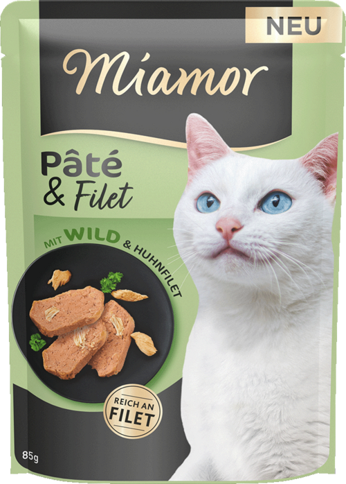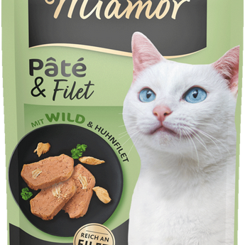 Miamor Pâté & Filet - ausschließlich pures Fleisch und Innereien in bester Qualität. Ergänzt mit sichtbaren, hochwertigen Huhnfiletstücken, bieten sie eine verführerische Futterportion für das tägliche Wohlergehen anspruchsvoller Katzen. Die verwendeten Fleischsorten sind wertvolle Eiweiß-, Vitamin D- und Taurin-Lieferanten. Getreidefreie, glutenfreie und zuckerfreie Rezeptur, ohne Farb- und Konservierungsstoffe.