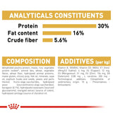 ANALYTISCHE BESTANDTEILE: Protein: 30,0% - Rohfaser: 5,6% - Fettgehalt: 16,0% - Rohasche: 7,6% - Omega-6-Fettsäuren: 3,9% - Omega-3-Fettsäuren: 0,9% - L-Carnitin: 200 mg/kg