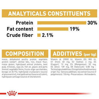 ZUSAMMENSETZUNG: Mais, Geflügelprotein getrocknet, Weizenkleber*, Tierfett, Reis, Maismehl, Maiskleber, hydrolysierte Tierproteine, Rübenschnitzel, Mineralstoffe (inkl. Pentanatriumtriphosphat; 0,35%), Sojaöl, pflanzliche Fasern, Fischöl, Hefenerzeugnisse, Fructo-Oligosaccharide, Borretschöl, Glucosamin aus Fermentation, Tagetesmehl, Knorpel hydrolysiert (Quelle für Chondroitin)