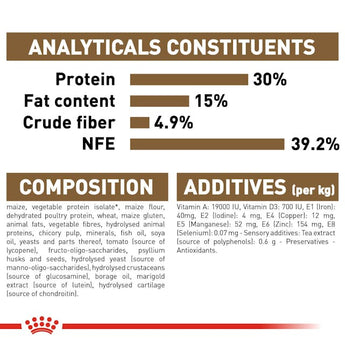 ZUSAMMENSETZUNG: Mais, Weizenkleber*, Maismehl, Geflügelprotein getrocknet, Weizen, Maiskleber, Tierfett, pflanzliche Fasern, hydrolysierte Tierproteine, Zichorienpülpe, Mineralstoffe, Fischöl, Sojaöl, Hefenerzeugnisse, Tomatenpülpe getrocknet (Quelle für Lycopen), Fructo-Oligosaccharide, Psyllium (Schalen und Samen), Hefen (Quelle für Mannan-Oligosaccharide), Borretschöl, Glucosamin aus Fermentation, Tagetesmehl, Knorpel hydrolysiert (Quelle für Chondroitin)
