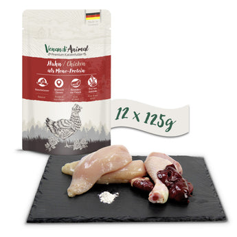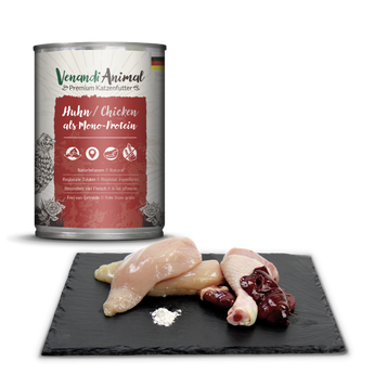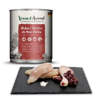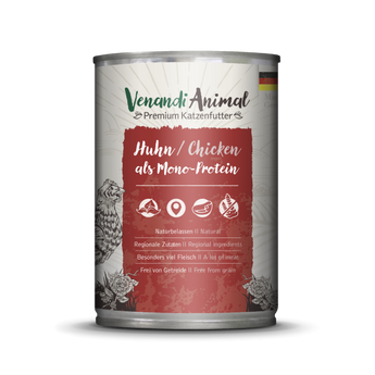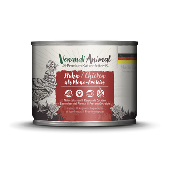 Venandi Nassfutter Huhn versorgt Ihre Katze mit allen wichtigen Nährstoffen und ist durch seine natürlichen und delikaten Zutaten äußerst schmackhaft. Der hohe Fleischanteil des Menüs stammt aus einer Proteinquelle, was selbst bei Katzen mit empfindlicher Verdauung zu einer sehr hohen Verträglichkeit führt. Neben frischem Muskelfleisch sind nahrhafte Innereien enthalten, die auf natürliche Weise den Bedarf an Vitaminen und Mineralstoffen decken.