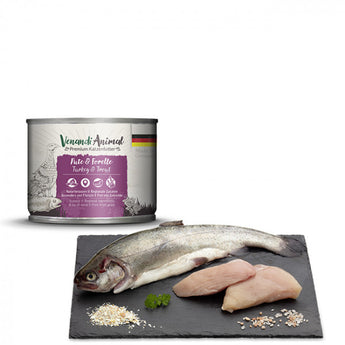 Forelle 34,5%, Putenfleisch, -leber, -herz, -muskelmagen 34,5%, Fleischbrühe 29,6%, Mineralstoffe 1%, Eierschalenpulver getrocknet 0,4%.