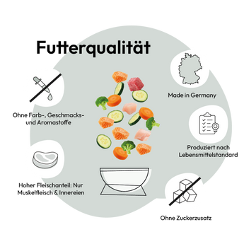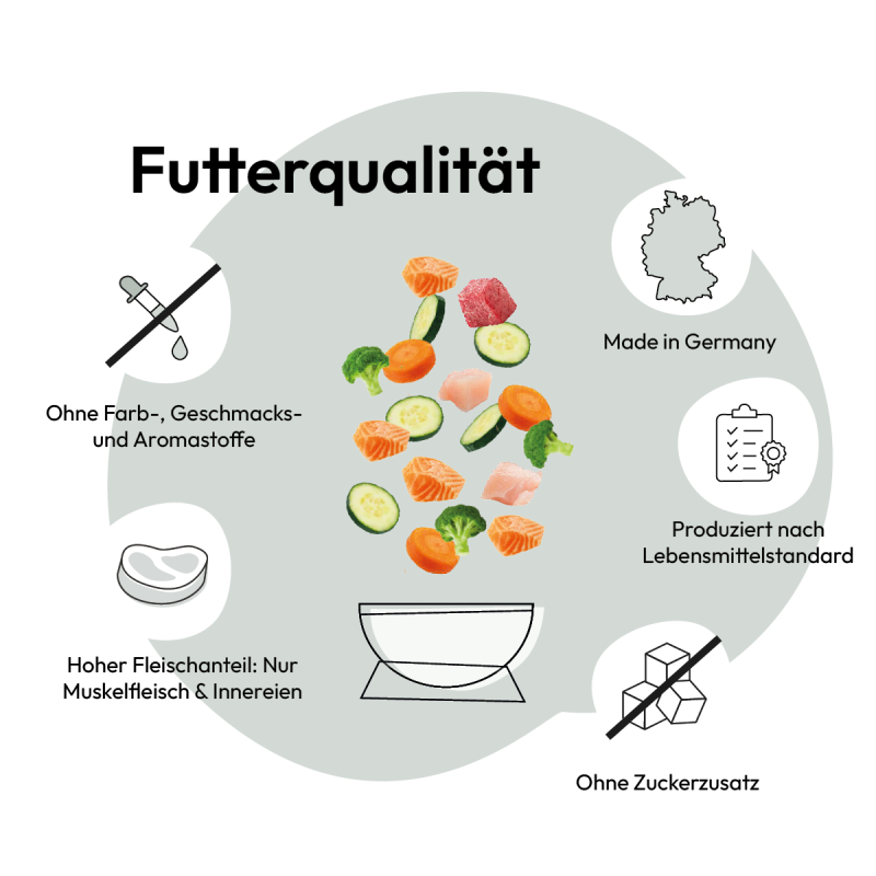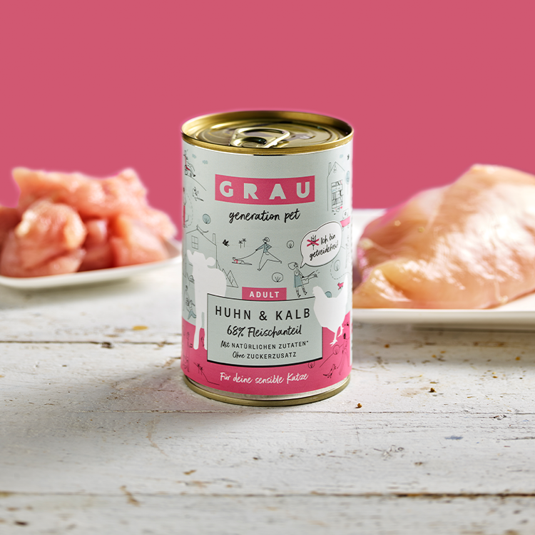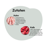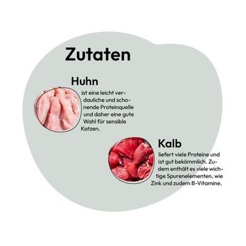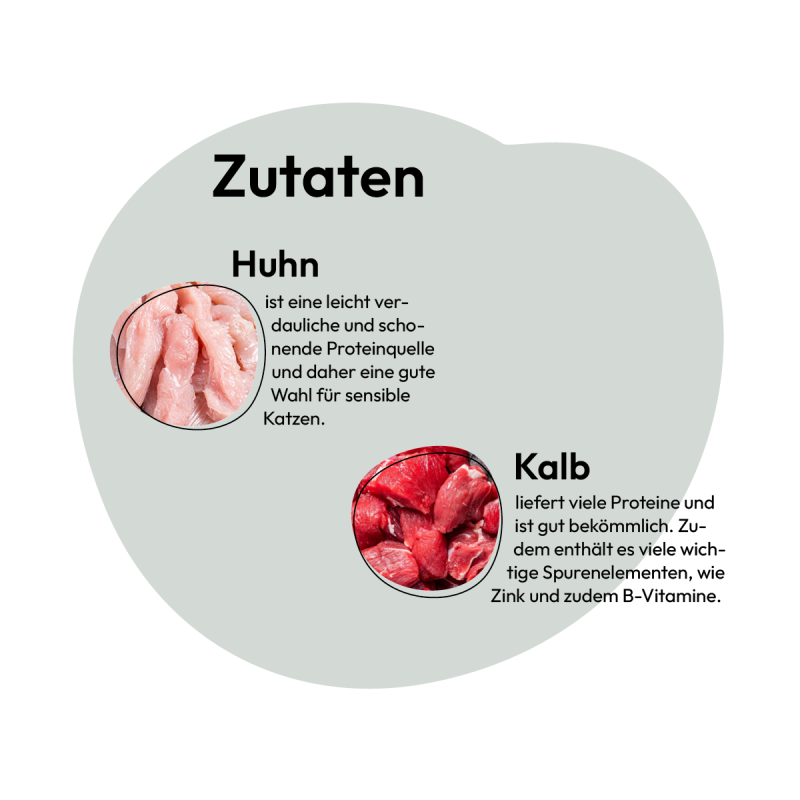 Das Duo aus Huhn und Kalb ist gut verdaulich und reich an Vitaminen. Huhn ist besonders bekömmlich und eine magere Proteinquelle mit einer Extraportion an B-Vitaminen. Kalbfleisch liefert ebenso viele Proteine und versorgt deine Katze mit wichtigen Vitaminen und Spurenelementen, wie Zink und B-Vitaminen.