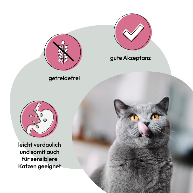 Huhn ist eine leicht verdauliche und magere Proteinquelle und liefert deinem Vierbeiner schonend die Energie für all eure Abenteuer. Es ist daher eine gute Wahl für sensible Katzen.