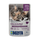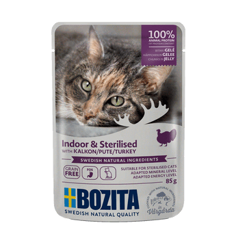 Bozita Indoor & Sterilised Pute ist ein ausgewogenes Alleinfuttermittel für die erwachsene Katze. Das Futter ist auf den etwas geringeren Energiebedarf von Wohnungs- und sterilisierten Katzen abgestimmt und somit auch für ältere und übergewichtige Katzen geeignet. Es enthält L-Carnitin, das ein wesentlicher Bestandteil des Stoffwechsels der Katze ist. Schwedische Pute macht das Futter besonders schmackhaft und leicht verdaulich, sodass die Katze die Nährstoffe leichter aufnehmen kann. Cellulosefasern reduzieren das Risiko von Haarballen. Zur Unterstützung einer gesunden Darmflora enthält das Produkt präbiotisches FOS. Das Produkt enthält außerdem einen ausgewogenen und auf sterilisierte Katzen abgestimmten Mineralstoffgehalt (Ca, P, Mg) sowie einen hohen Anteil an Vitaminen und Taurin.