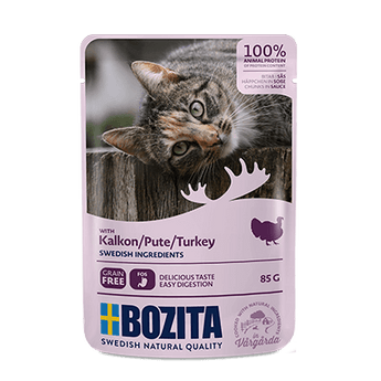 Häppchen in Soße mit Pute. Unsere Pute kommt von ausgewählten schwedischen Höfen in der Nähe unserer Küche in Vårgårda. Frisch zubereitete Pute ist ein Geschmackserlebnis, das Katzen lieben.