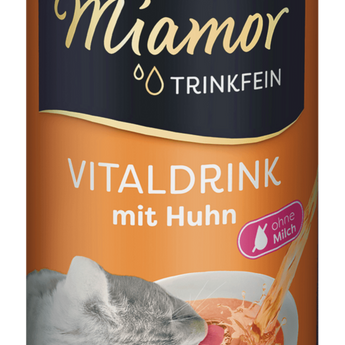 Vitaldrink mit Huhn. Motiviert zu höherer Flüssigkeitsaufnahme. Katzen trinken oft nur sehr wenig, da sie ihren Flüssigkeitsbedarf bevorzugt über die Nahrung decken. Wenn keine ausreichende Menge an Flüssigkeit aufgenommen wird, neigen Katzen häufiger zu Harnsteinen (dies gilt insbesondere für reine Trockenfutterverwender). Hier unterstützt Miamor Trinkfein durch seine besondere Schmackhaftigkeit.