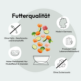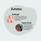 Besonders für dein Kitten ist es wichtig, dass es mit allen notwendigen Nährstoffen versorgt wird. Frisches Geflügel und Fisch machen das Futter nicht nur richtig schmackhaft, sondern sorgen auch dafür, dass dein Kitten bis zum Ende der Wachstumsphase gut versorgt ist. Neben allerlei heimischen Superfoods wie Leinsaat, Erbsen, Blaubeeren und Ringelblumenblüten für einen Extra-Boost an Nährstoffen tragen die enthaltenen Mannane und Glucane zur Stabilisierung der Darmflora und Immunabwehr deiner kleinen Samtpfote bei. So steht euch nichts im Weg, gemeinsam die Welt zu entdecken!
