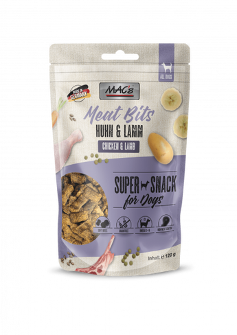 MACs MEAT BITS Huhn & Lamm sind besonders schmackhaft und mit viel frischem Fleisch zubereitet. Der hohe Fleischanteil und die getreidefreie Rezeptur, in Kombination mit Obst und Gemüse, sorgen außerdem für einen bekömmlichen Leckerbissen. Ihr Hund wird MACs lieben!